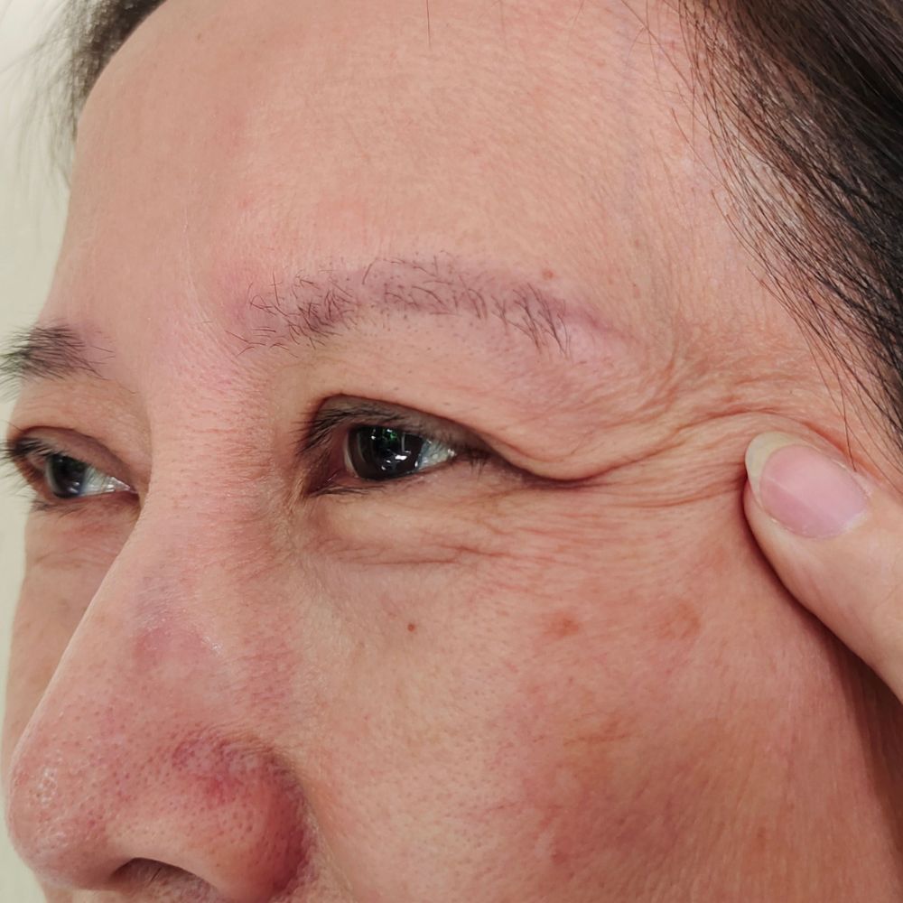 - 윗눈꺼풀 근육(상안검거근) 기능이 있을 때 적용