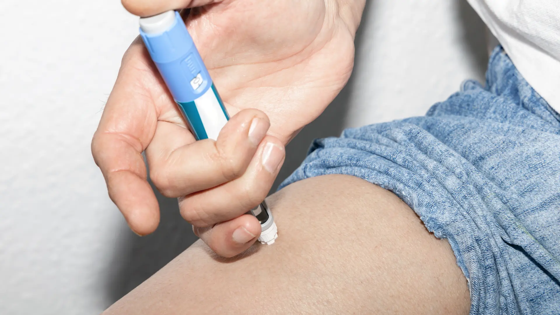 - 펜 캡을 제거하고, 주사 부위에 펜을 수직으로 밀착시킵니다.